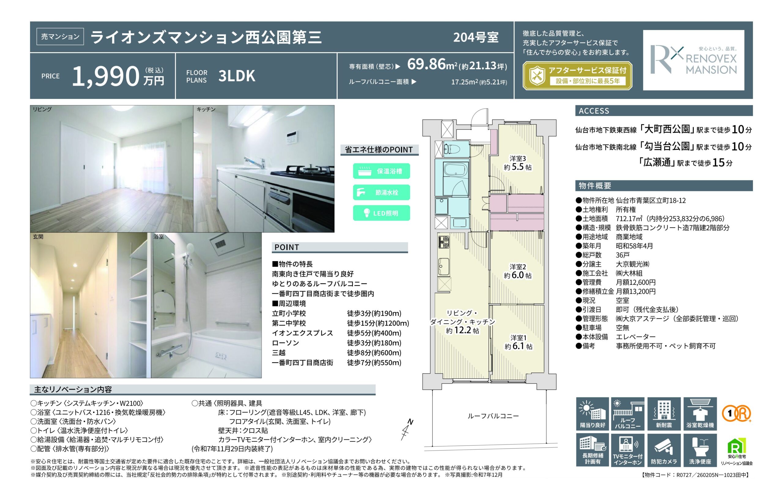 値下げ!ライオンズマンション西公園第三204号室 2026.01.21