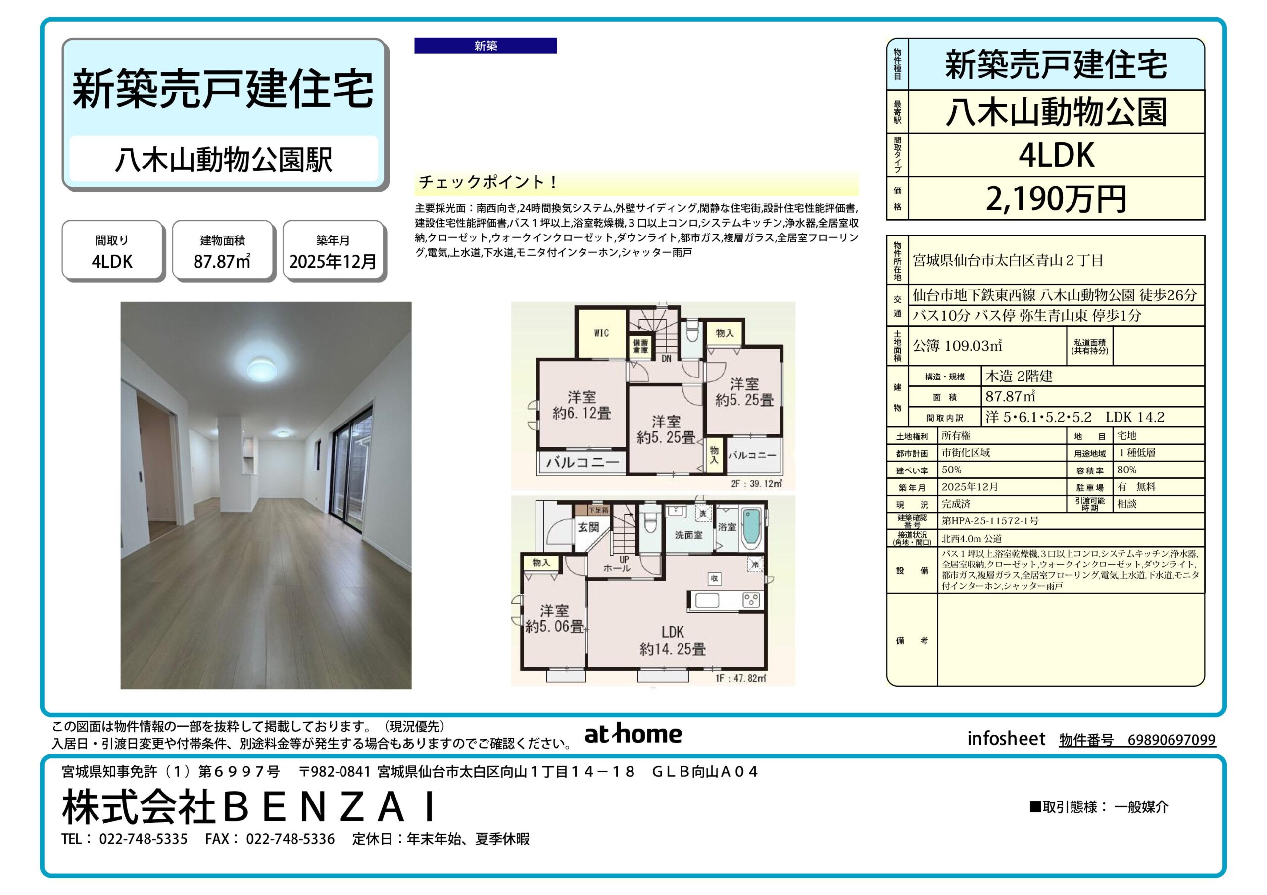 交通仙台市営地下鉄東西線「八木山動物公園」駅徒歩26分 バス停「弥生青山東」停徒歩1分