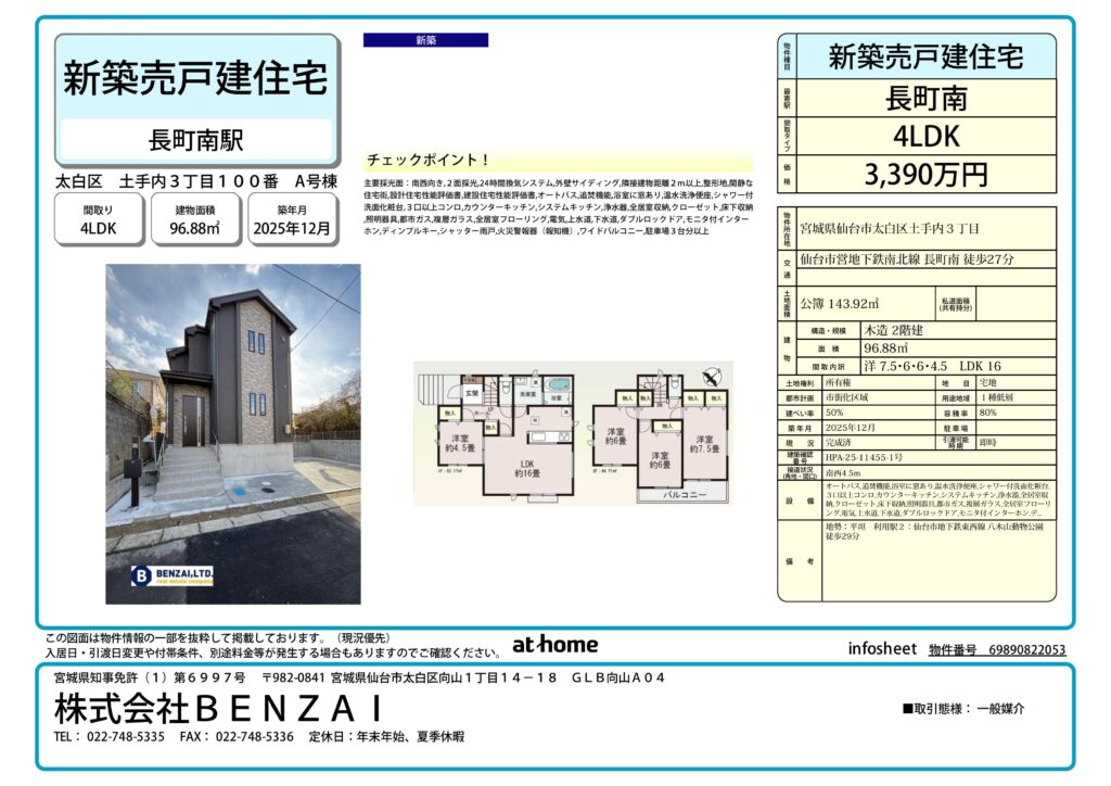 【アットホーム】仙台市太白区 土手内3丁目(長町南駅) 2階建 4LDK[6989082253]仙台市太白区の一戸建て(提供元:(株)BENZAI)|一軒家・家の購入